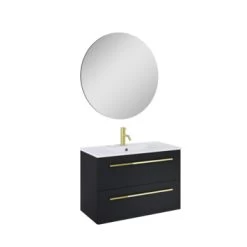 De Atlantic badmeubelset Stella met spiegel en witte wastafel 80cm Mat Zwart is een hangende set met een chique uitstraling. Dankzij het hangende design creëer je een ruimtelijke look in jouw badkamer. Het meubel is voorzien van 2 soft close laden en een mat zwarte keramische wastafel. Daarnaast is aan deze set een losse ronde spiegel toegevoegd. De set is voorzien van stijlvolle messing grepen, wat zorgt voor een chique en industrieel uiterlijk. De set wordt flatpacked geleverd en is eenvoudig te installeren met de meegeleverde bevestigingsmaterialen. Exclusief wastafelkraan.