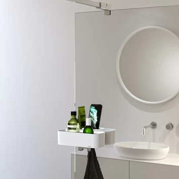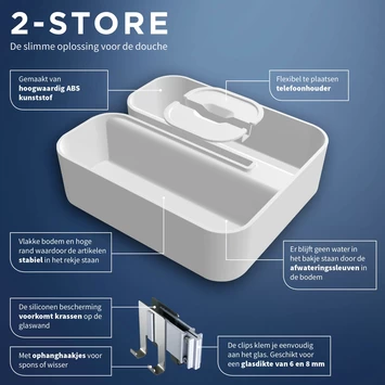 Opbergruimte tekort? Geen nood. Creëer meer ruimte achter de glaswand met de Tiger 2-Store douchemand met klem. Dit product biedt elementen van karakter met slimme en stijlvolle opbergoplossingen. Zo klem je de korf gemakkelijk aan de glaswand, zijn de haken flexibel te plaatsen en is de set voorzien van een universele telefoonhouder. Daarmee geniet je ook tijdens het douchen van je favoriete muziek. 2-Store brengt een moderne look in je badkamer en is gewapend voor een duurzaam bestaan.