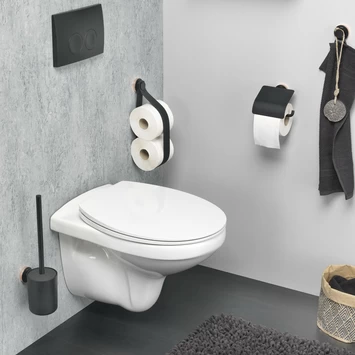 De Tiger Toiletborstelhouder Urban Hangend Zwart is uitgevoerd in de kleur mat zwart en wordt geleverd met twee decorringen. De decorringen, in de kleur licht eiken en grijs, maken het mogelijk een subtiel kleuraccent toe te voegen. Het is ook mogelijk het borstelgarnituur zonder de decorring te monteren waardoor het zeer eenvoudig is om het product aan de gewenste stijl aan te passen. Bij de montage van het artikel wordt gebruik gemaakt van een muurplaatje waardoor de bijgeleverde bevestigingsmaterialen uit het zicht verdwijnen. Deze serie bevat tevens een vrijstaand toiletborstelhouder naast een groot aantal aanvullende accessores voor de badkamer en de toiletruimte. Alle in dezelfde stijl. De artikelen uit de serie zijn ook in de kleur mat wit verkrijgbaar, waarbij natuurlijk ook weer diverse decorringen worden meegeleverd. De toiletborstelhouder is tevens geschikt voor montage met TigerFix type 1, waarmee accessoires snel en eenvoudig op een gladde, harde ondergrond te bevestigen zijn door middel van een gepatenteerd lijmsysteem. Boren is niet noodzakelijk en de accessoires zijn eenvoudig te verwijderen zonder dat er resten op de ondergrond achterblijven. TigerFix is los verkrijgbaar.